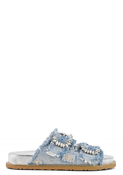 Di ispirazione Texas, questo sandalo a tripla fascia non passa certamente inosservato grazie alla presenza di più elementi che decorano la tomaia. La fascia alta ha una grossa fibbia lavorata che evoca, insieme all'inserto in tessuto della fascia centrale, il perfetto stile texano. Piccole borchiette sui profili danno un tocco luminoso e molto cool. Bellissimo con elementi denim e full fringes.