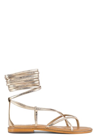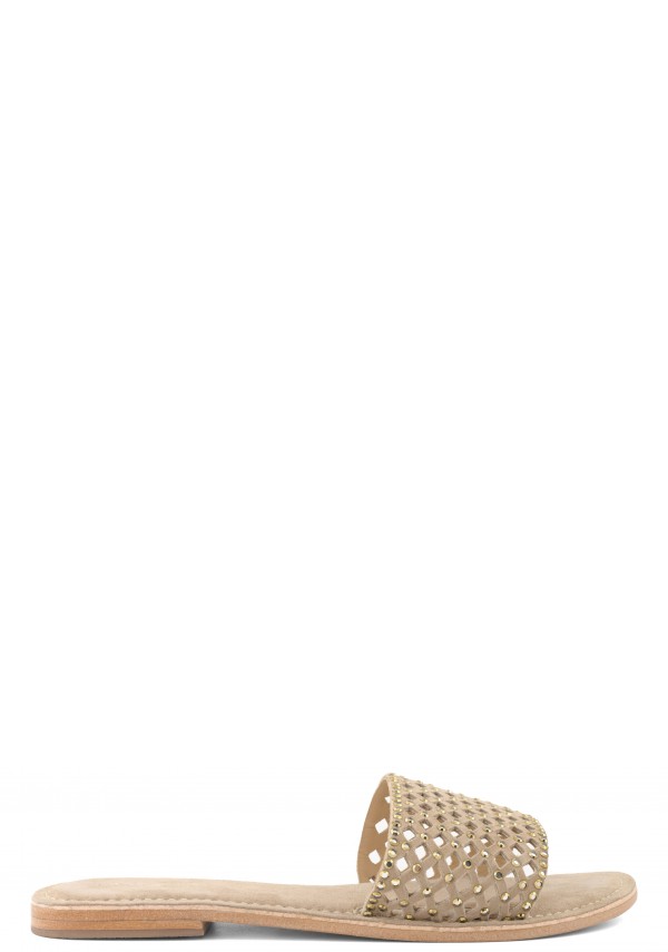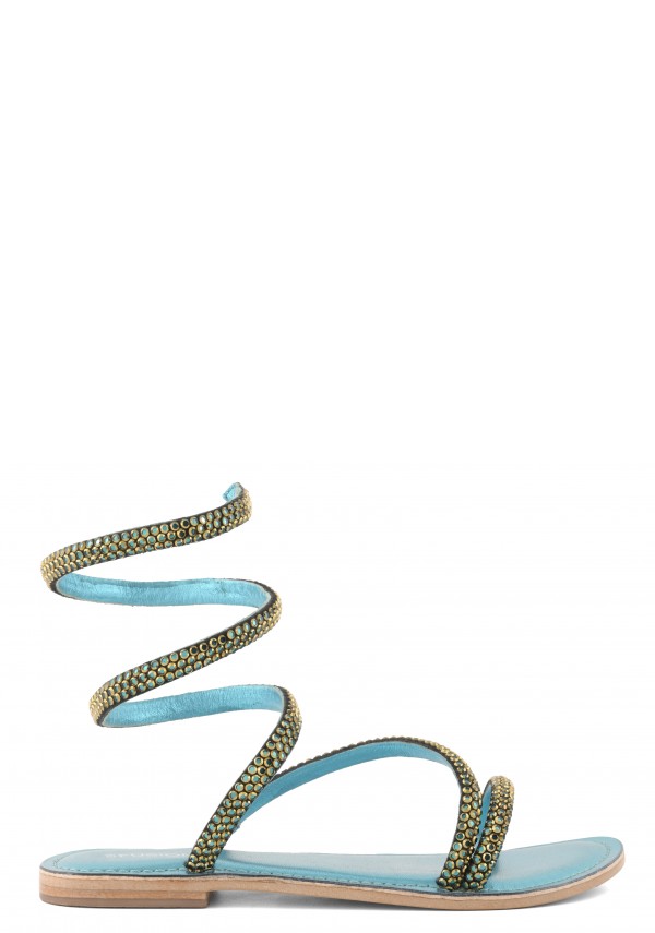 Eleganti fascette scintillannti si incrociano sul davanti creando un prezioso nodo gioiello. Il soletto in pelle di questo sandalo super flat in sinergia con l'elemento sparkling donano luce e glamour ad un modello davvero irrinunciabile nel guardaroba delle più fashioniste. Completo maschile o abito sirena total black per la sera o mini dress in candido lino per il giorno, completano il look.