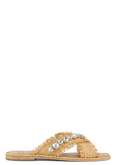 Doppia fascia e fibbia gioiello con pietre ton sur ton per questo modello di sandalo total denim con lavorazione intrecciata. Il duo chrome del pattern in cotone fa di questo sandalo un modello irresistibilmente glamour e originale. Questo stile è perfetto con la combo pantalone gaucho e maglia cropped o con un semplice abito tinta unita o fantasia.